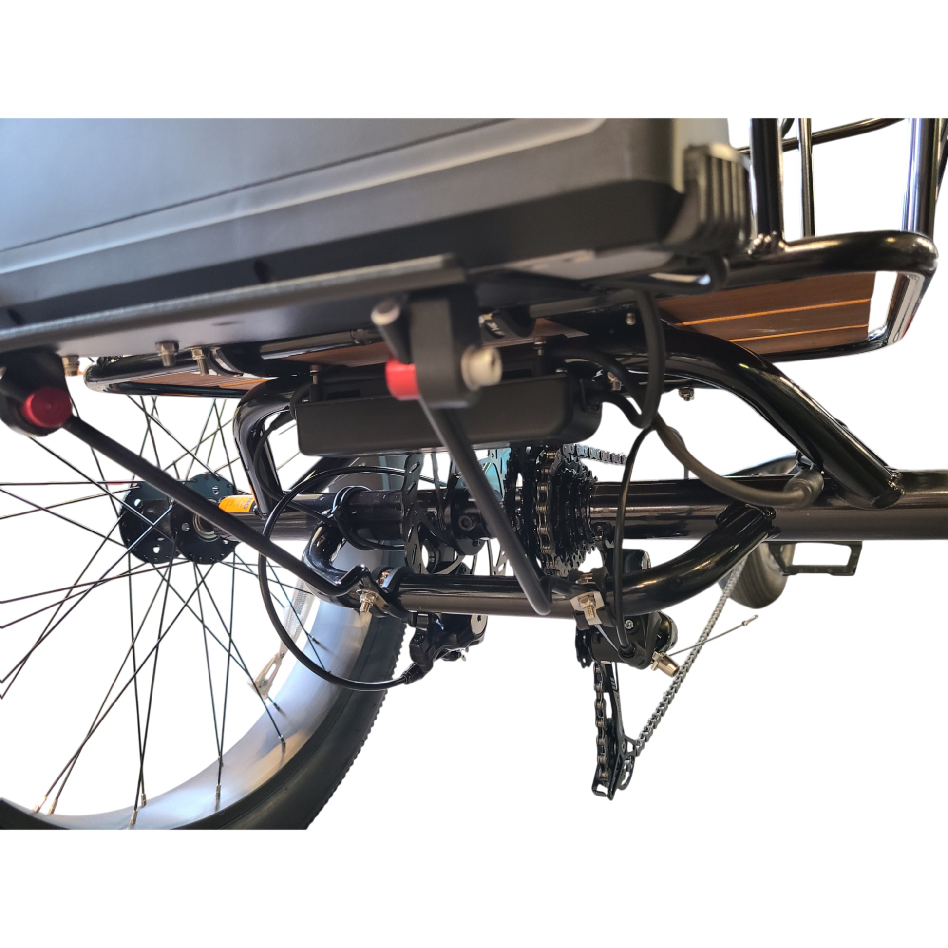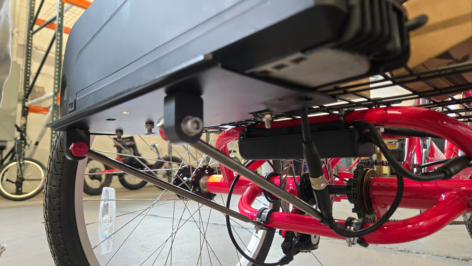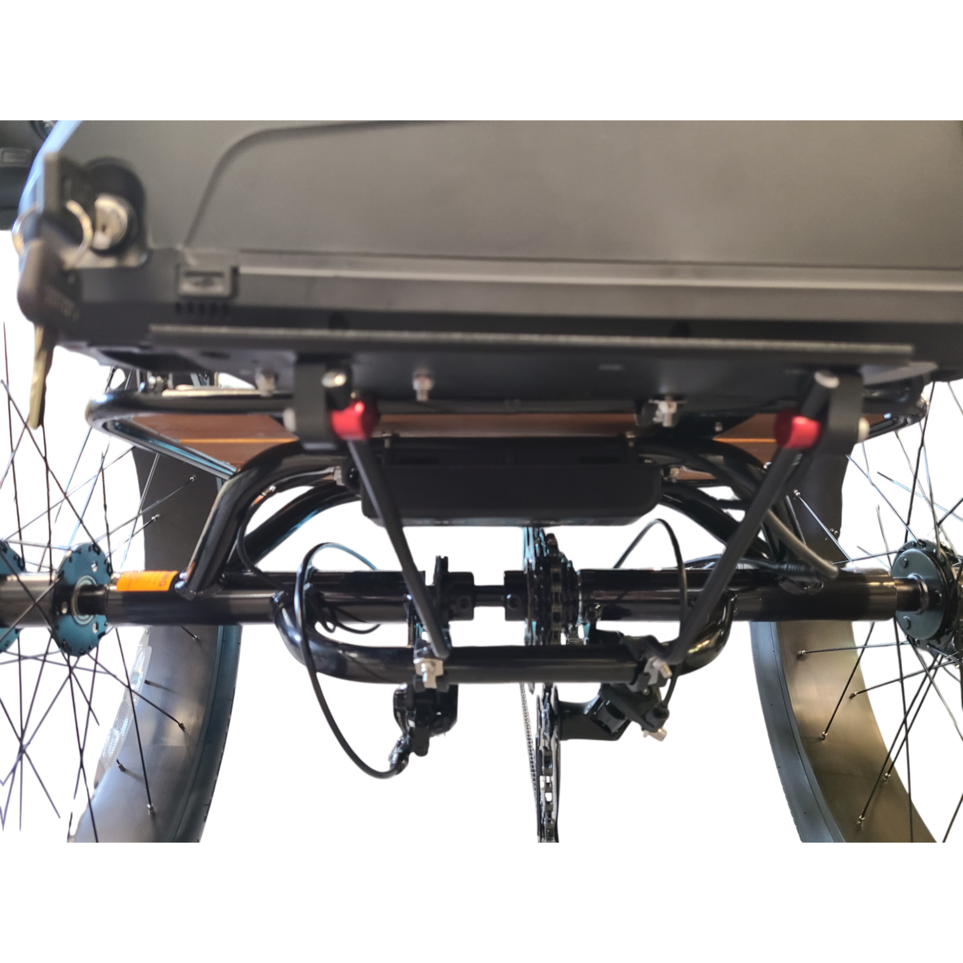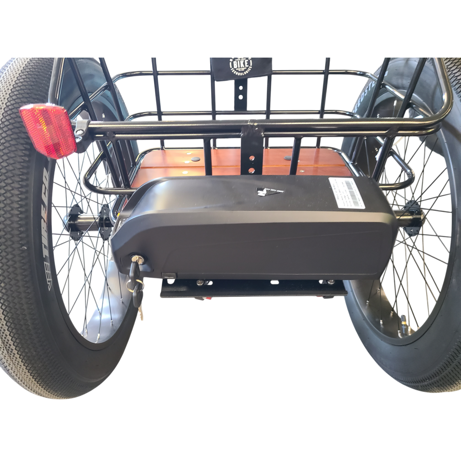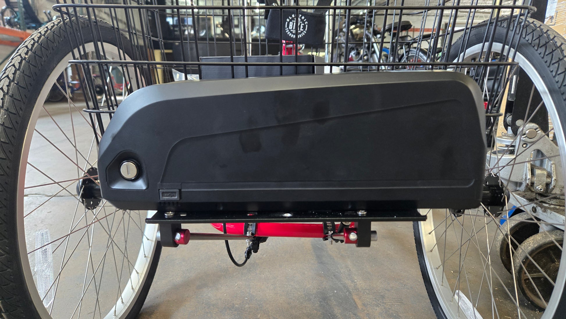 This hardware set securely mounts the E-BikeKit 48V 15Ah battery behind the basket, keeping the setup clean, balanced, and out of the way on traditional upright trikes.